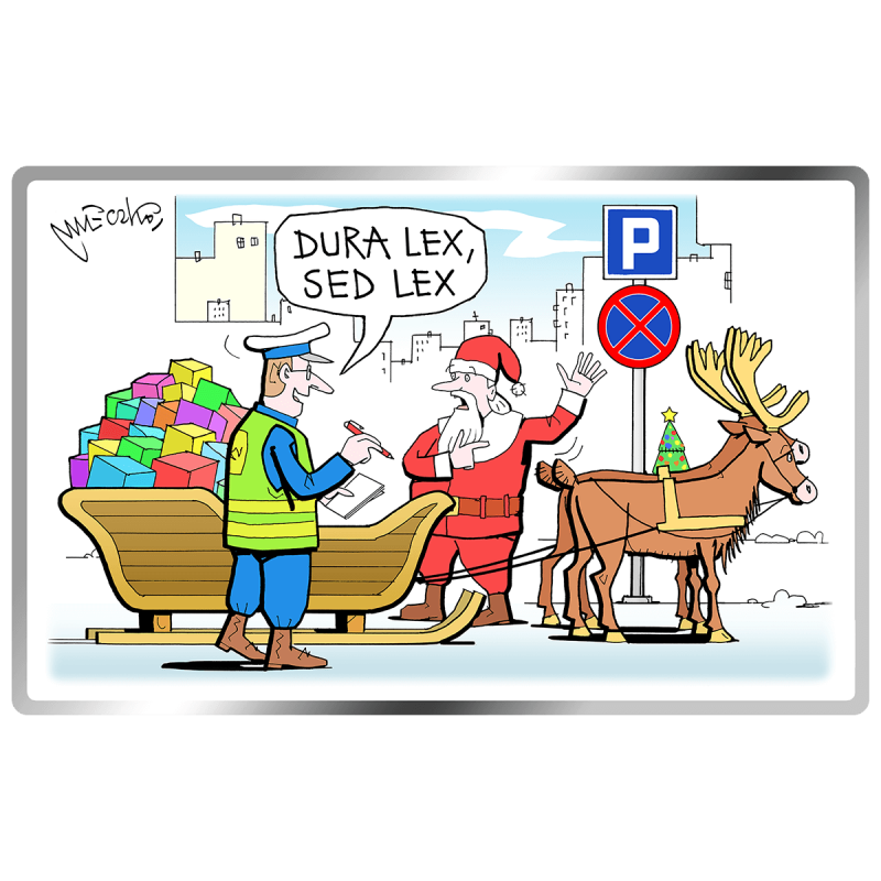 This exceptional silver coin features an official illustration by Andrzej Mleczko, one of the most renowned Polish cartoonists. The design presents Santa Claus confronted by the strict letter of the law — a humorous, ironic scene perfectly reflecting the artist’s signature style: clean linework, clever satire, and sharp commentary on everyday life.
