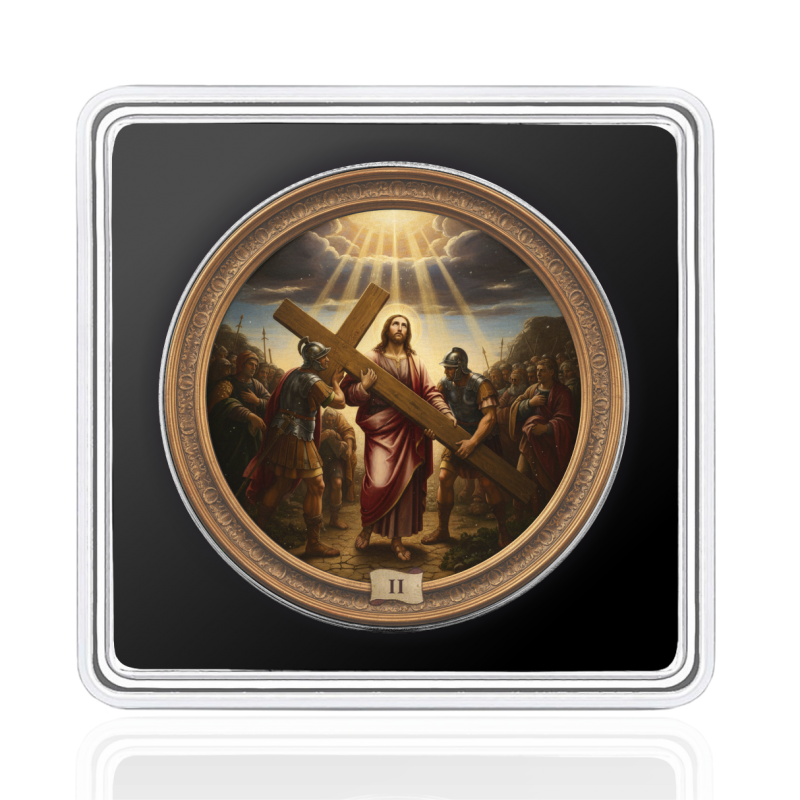 Embark on a profound spiritual journey through the Via Crucis — now faithfully preserved in a collection of fifteen full-color, 1 oz .999 fine silver coins, each depicting one of the sacred Stations of Christ’s Passion and Resurrection.