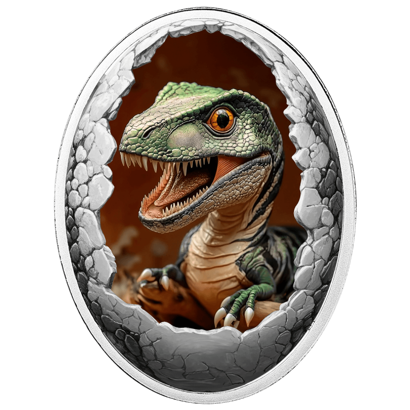 Każda moneta z tej limitowanej serii (500 sztuk) ukazuje scenę wykluwania się prehistorycznego giganta w realistycznym trójwymiarowym ujęciu.